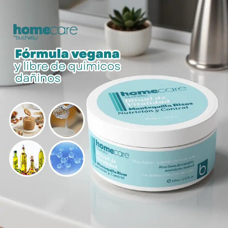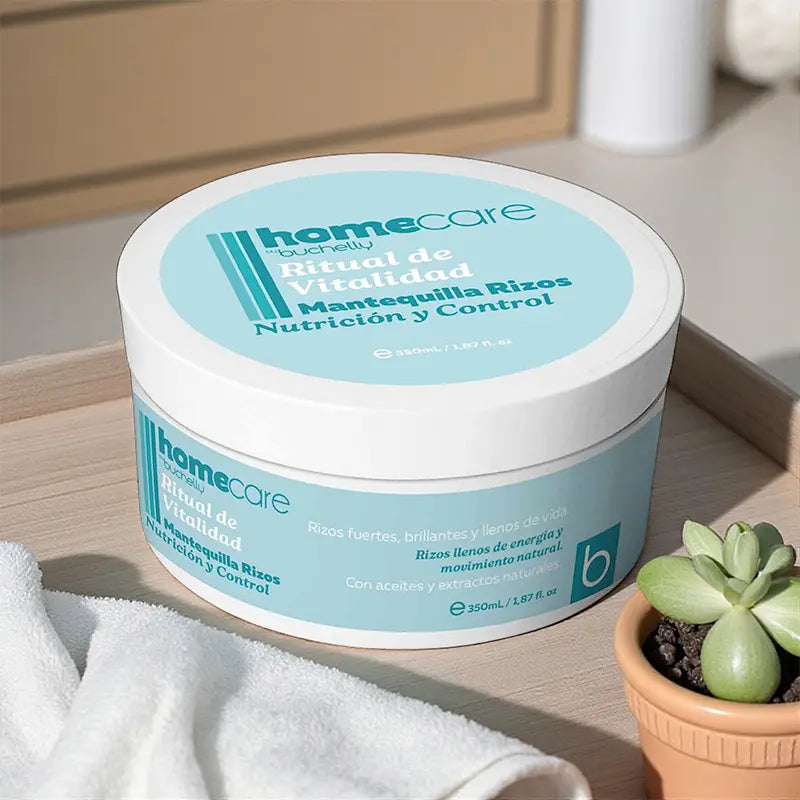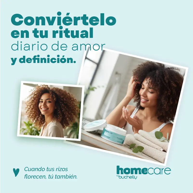 Descubre la nueva Mantequilla Rizos de Home Care by Buchelly, diseñada para nutrir, controlar el frizz y realzar la forma natural de cada rizo.